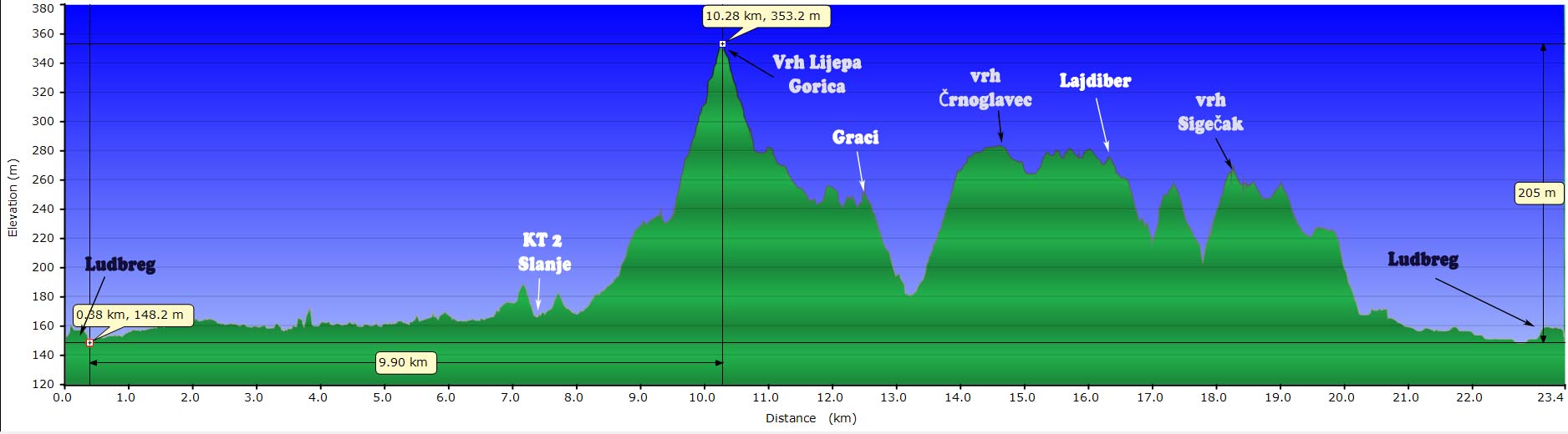 područja pa pored Bednje i povijesnog Budima te se iza Slanja uspinje na vrh Lijepu Goricu, a zatim nenadano izlazi iz šume u idilično vinogradarsko